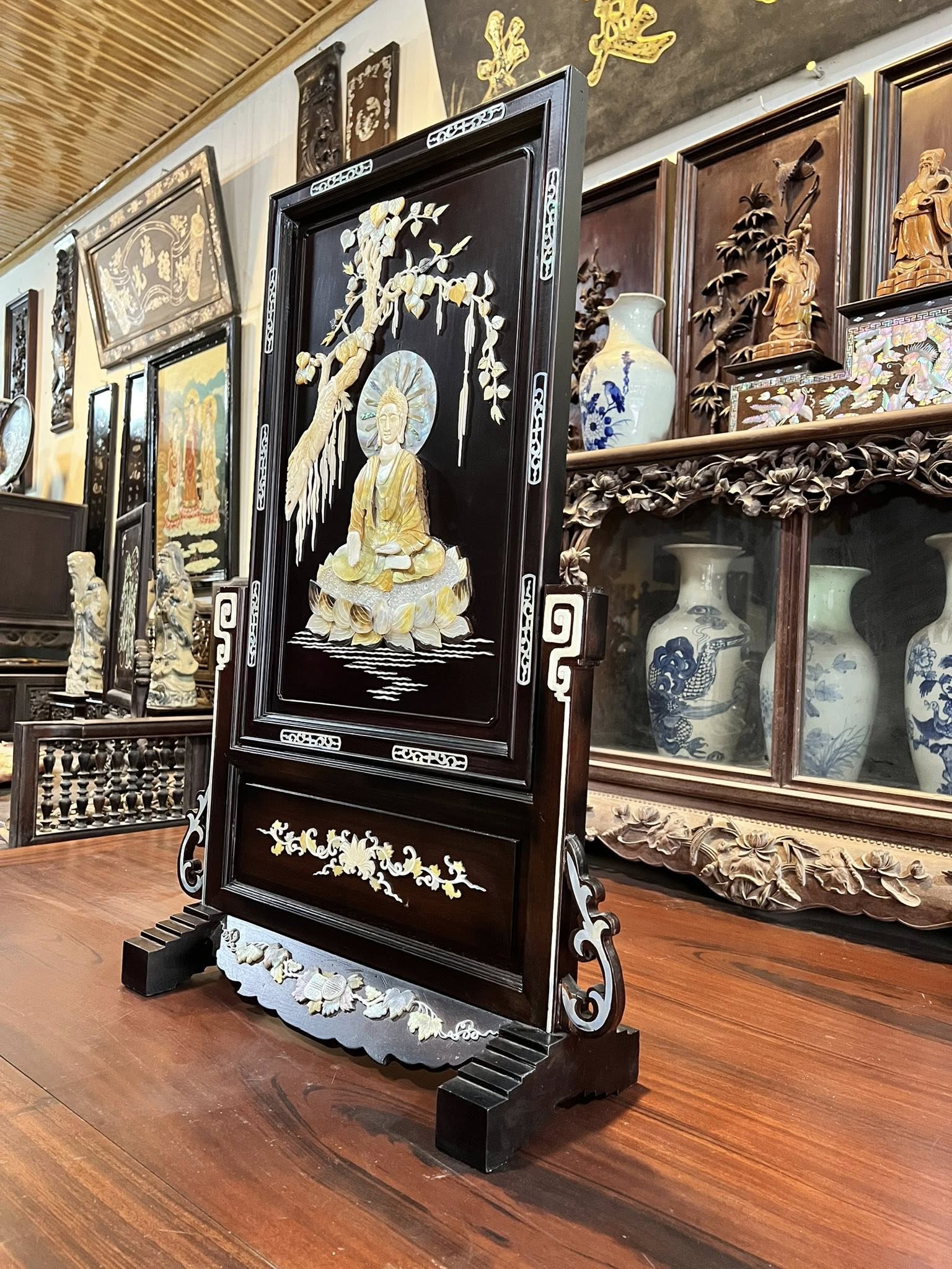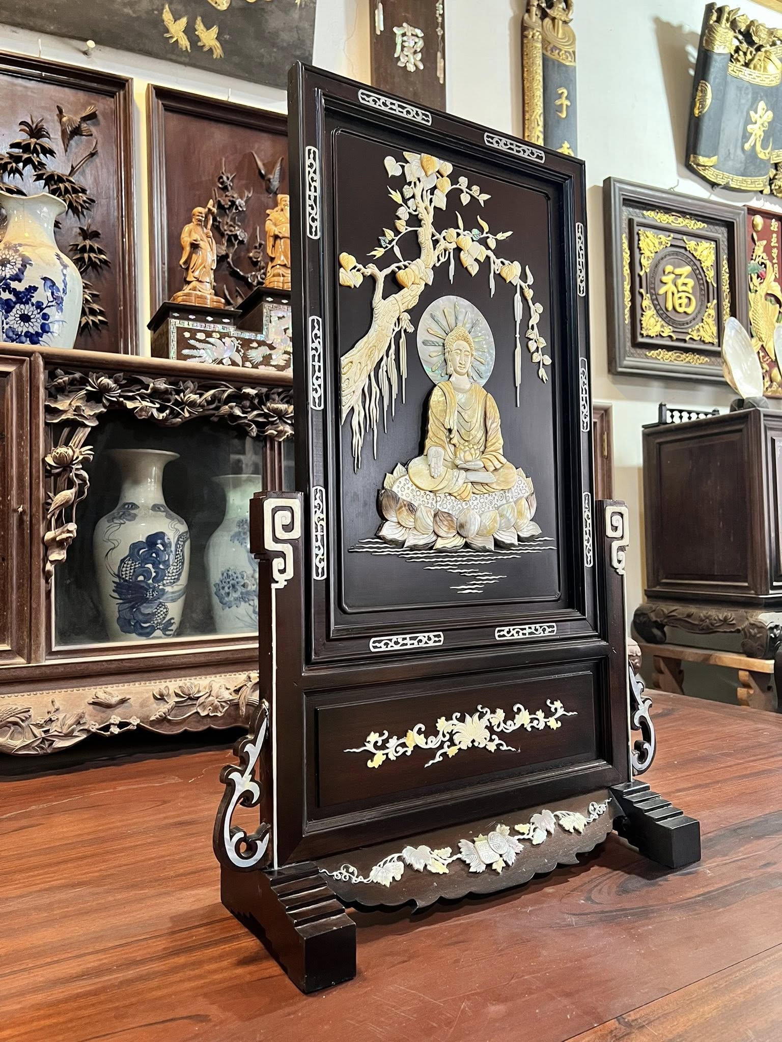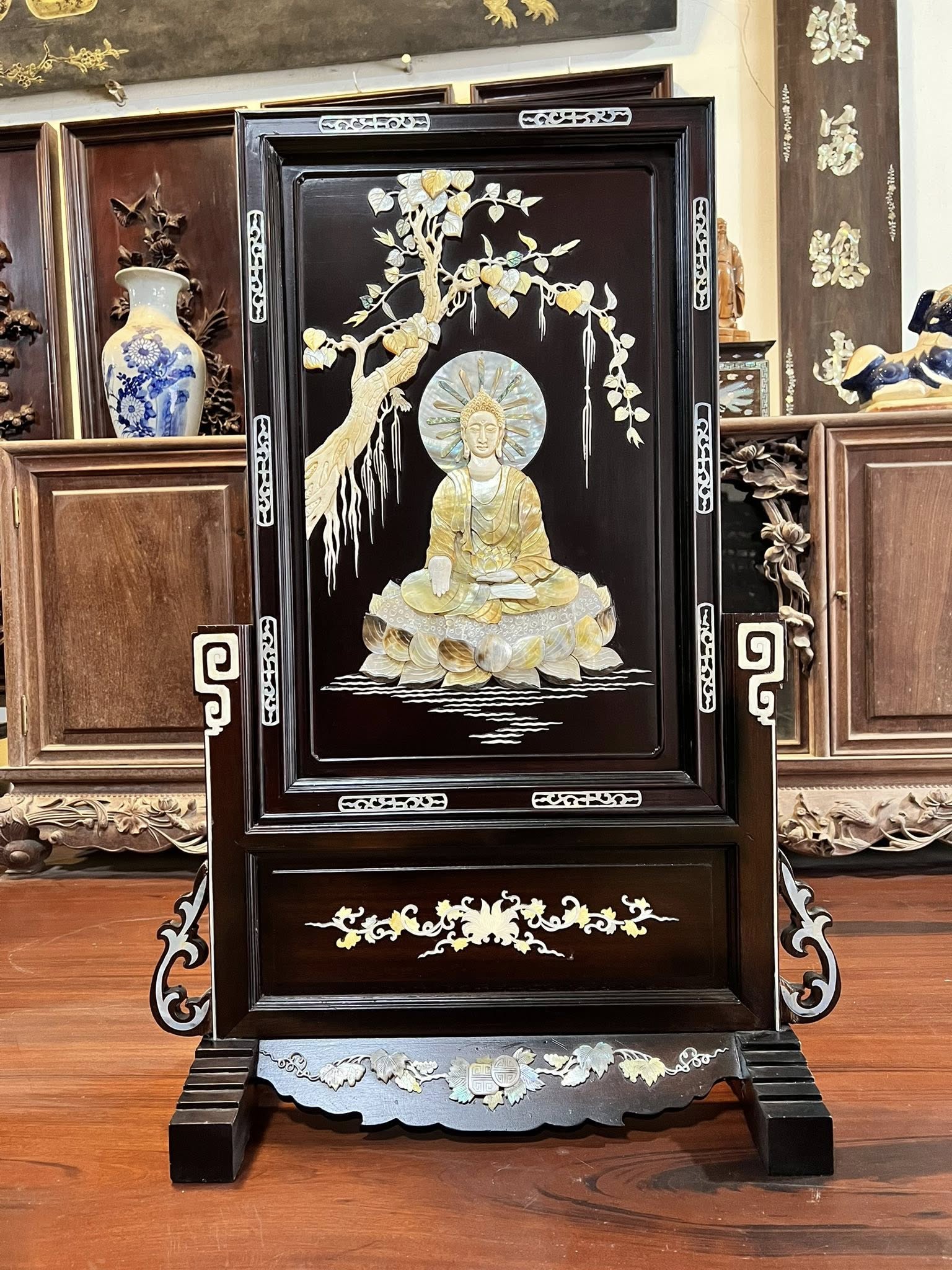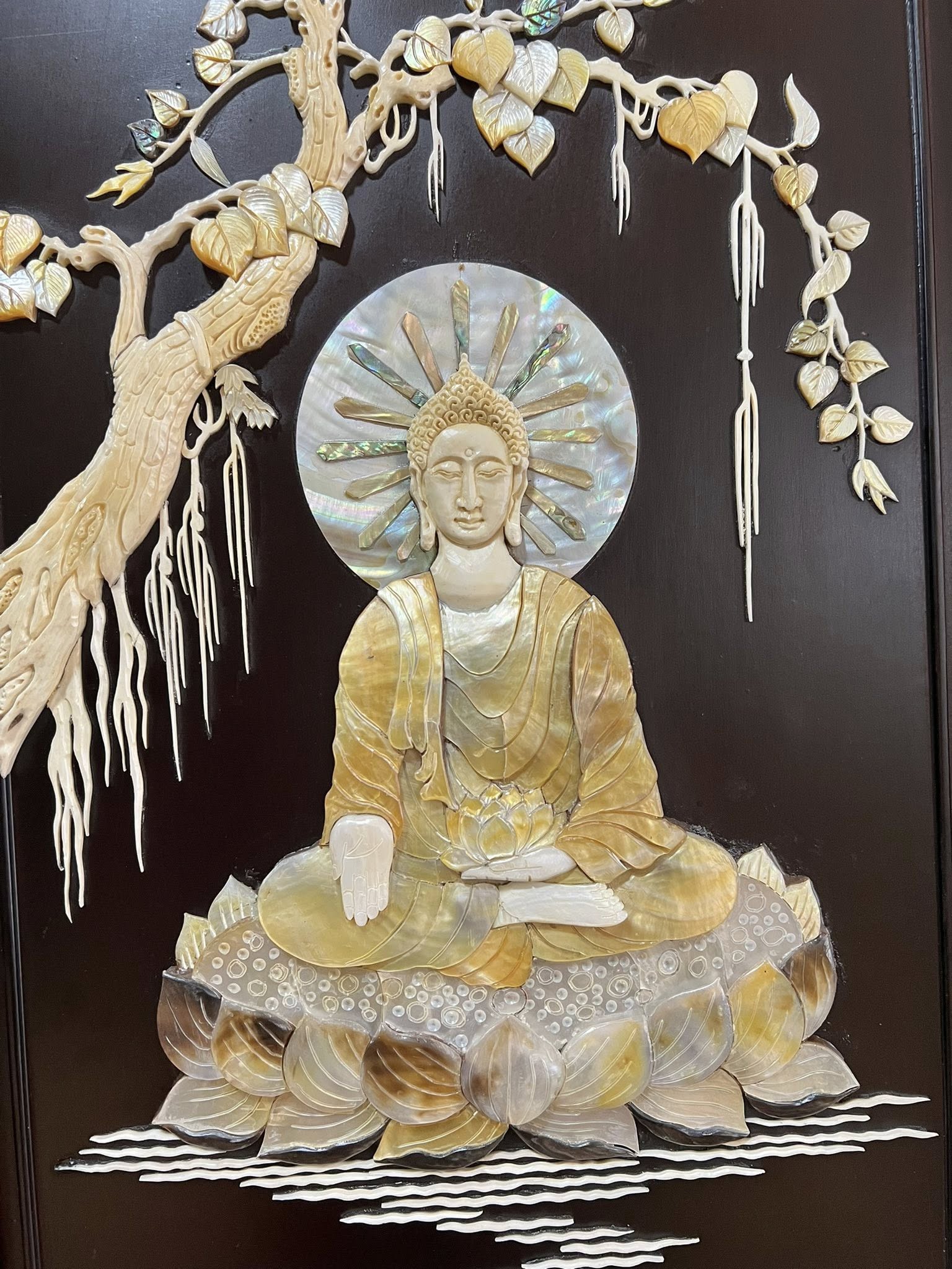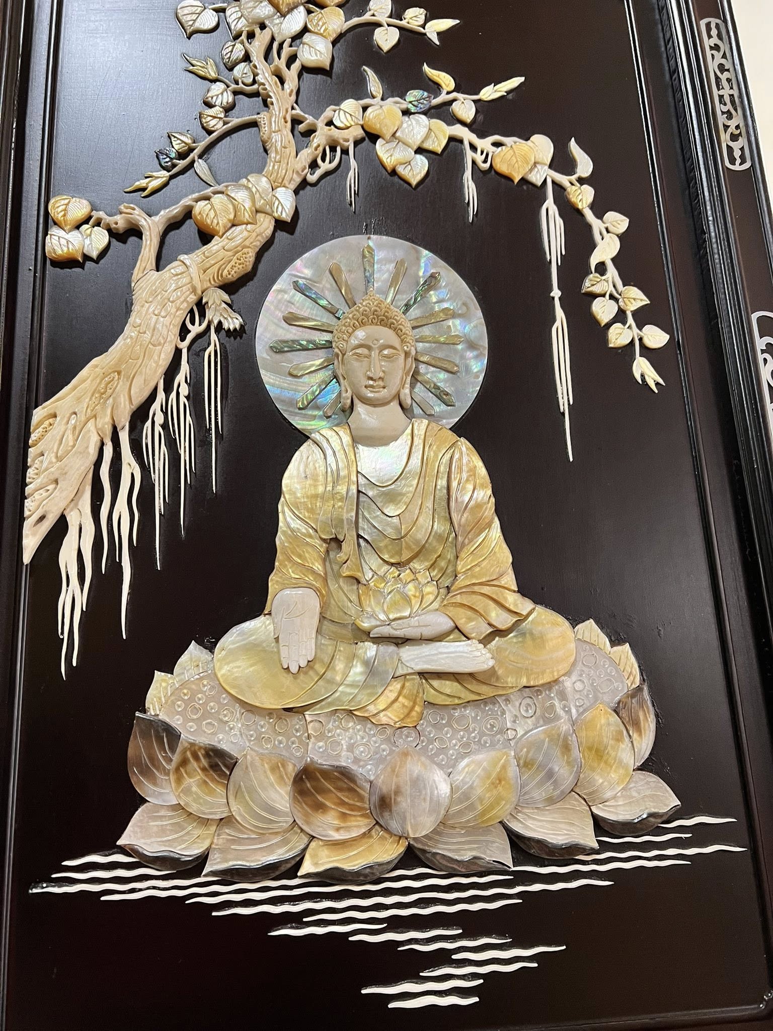 Bức Tranh Bình Phong Đức Phật A Di Đà…gỗ gụ đc khảm nổi rất đẹp & kì công đc làm bằng các nguyên liệu quý như Bào Ngư,Ốc,Trai,Khẩu,Xương..đẹp & giá trị